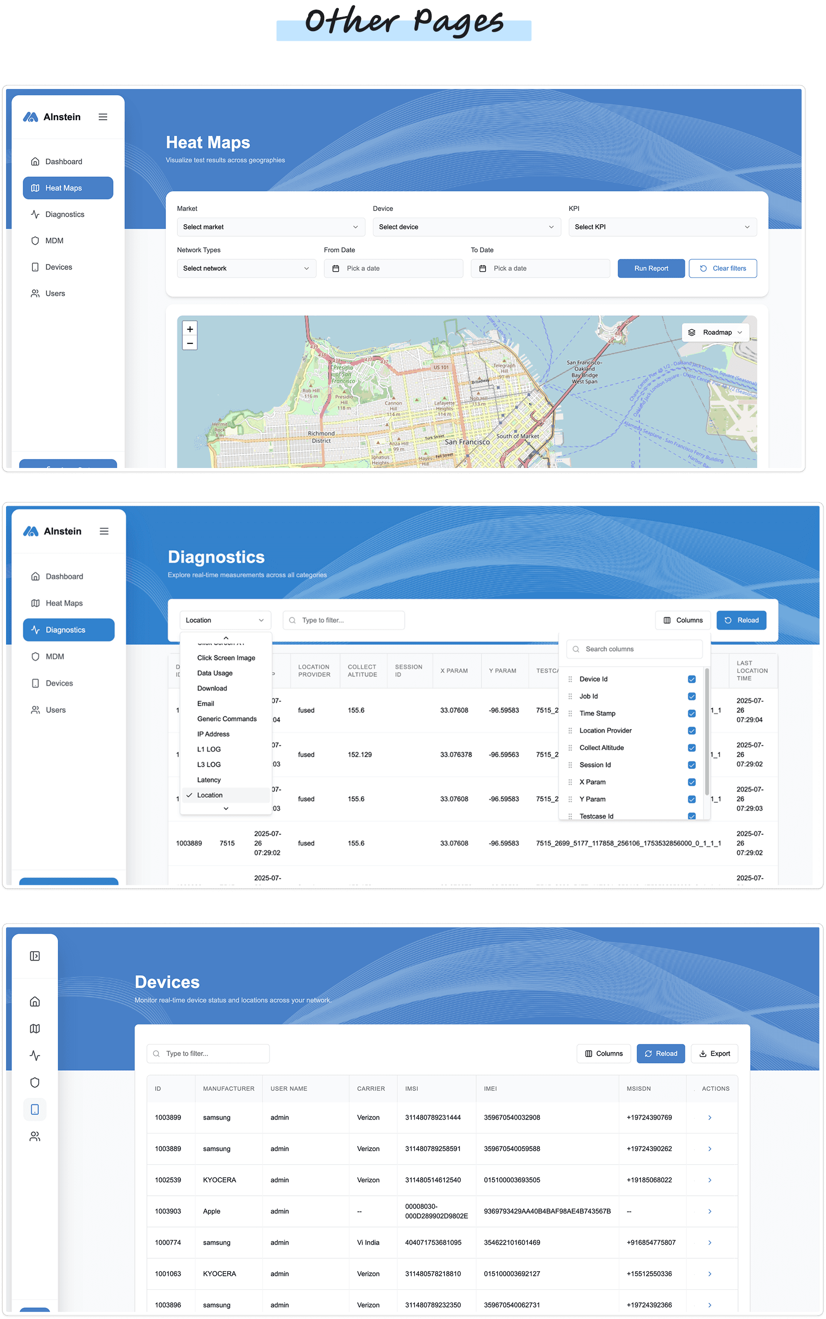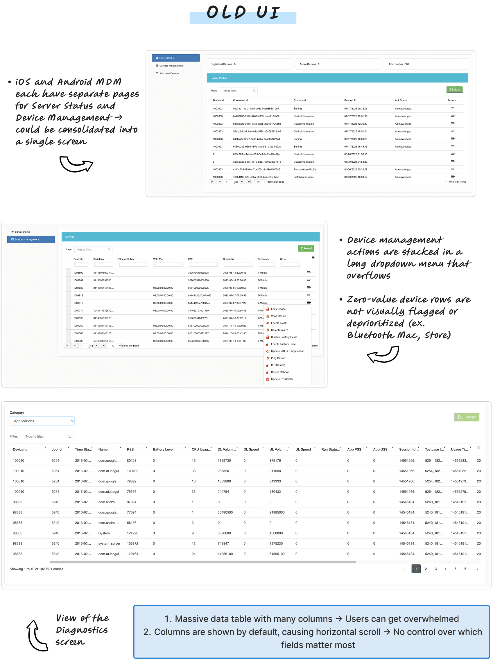 Mobile Device Management & Diagnostic Screens